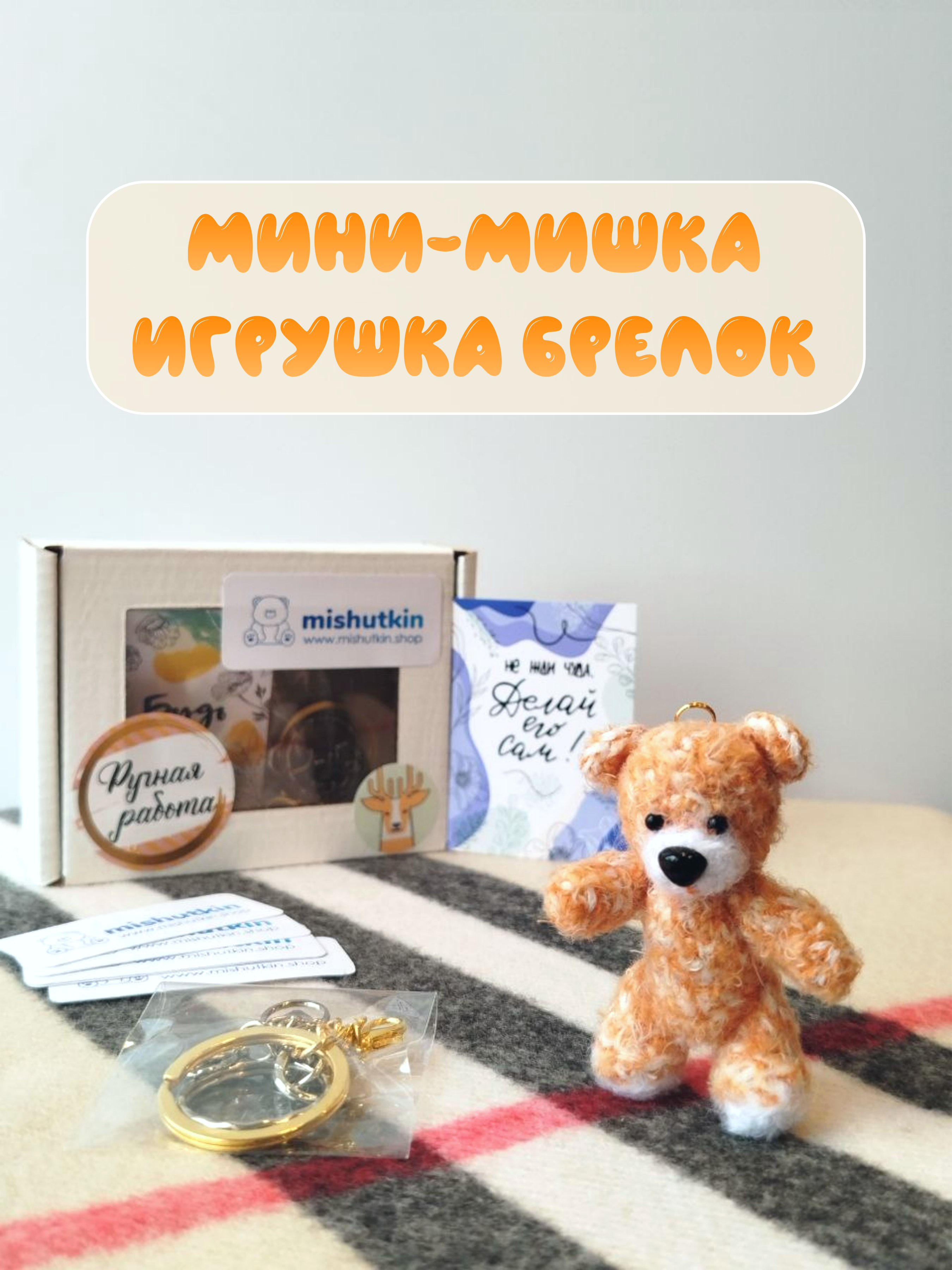 Мини-мишка брелок ручной работы. Оранжевый. 5 см. 100% нейлон.