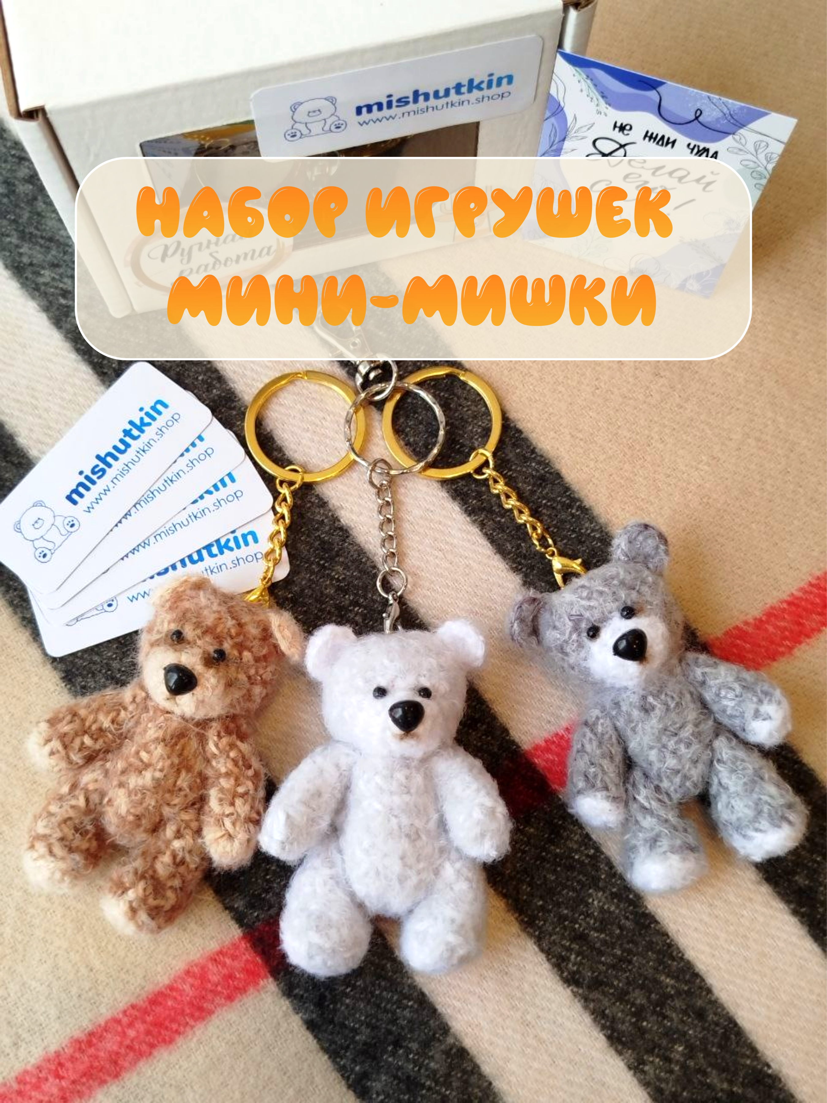 Набор из 3 игрушек. Мини-Мишки брелки ручной работы. Серия 4. 7см.