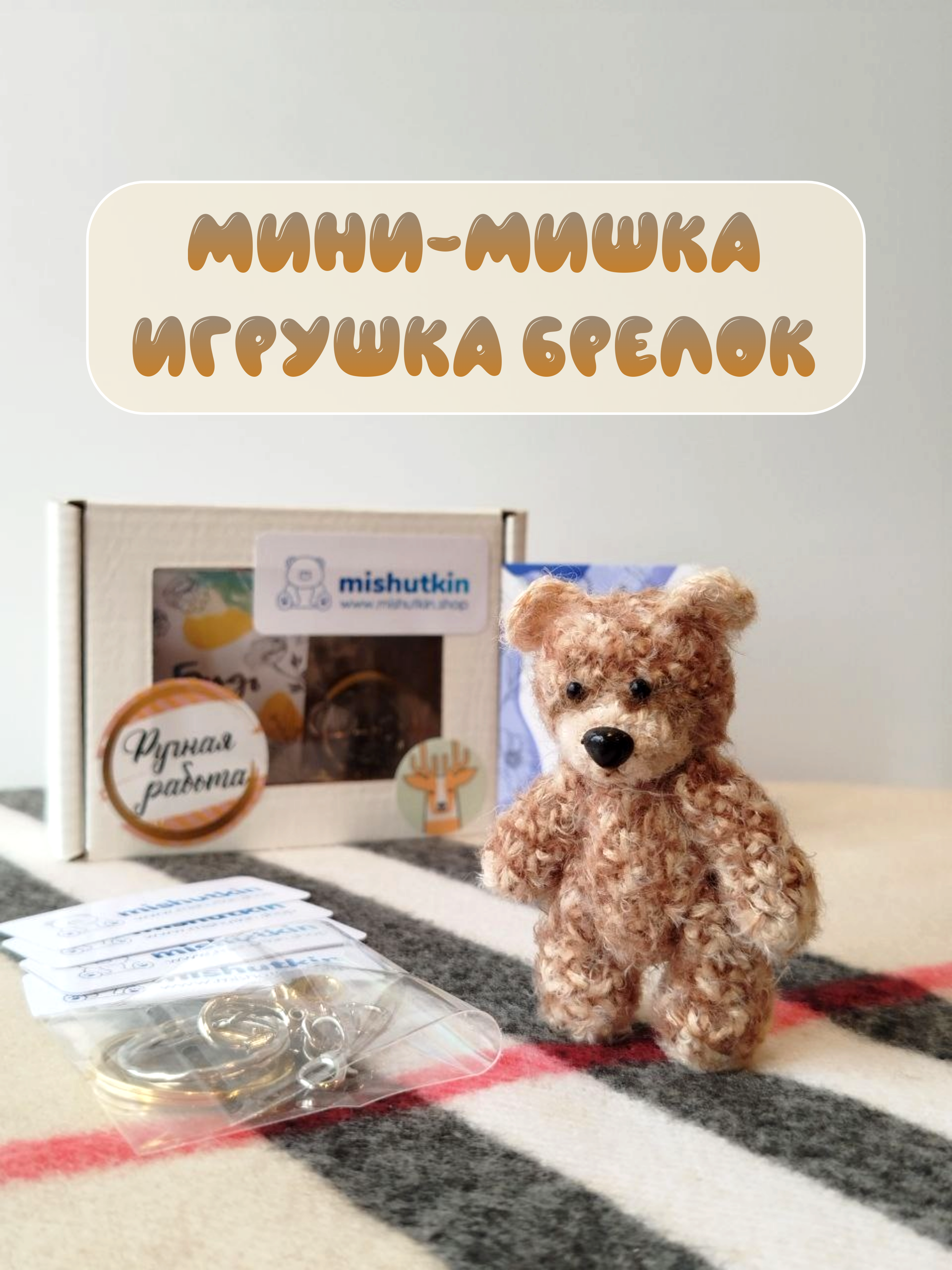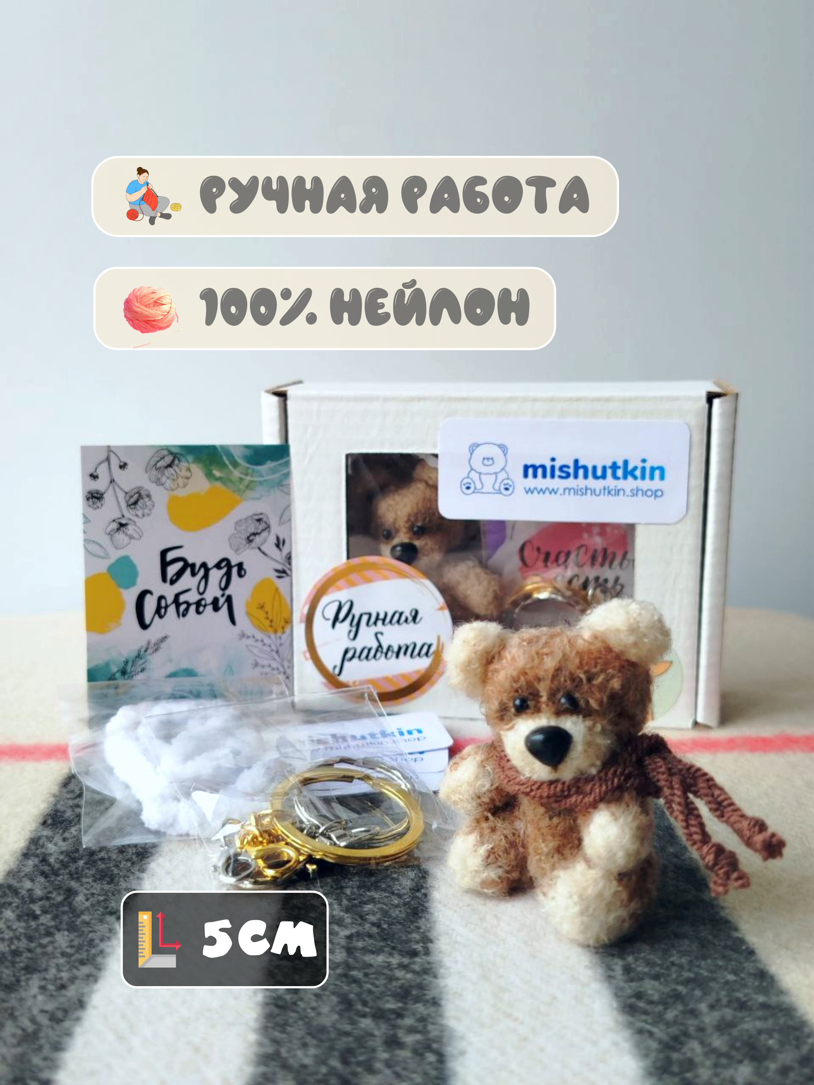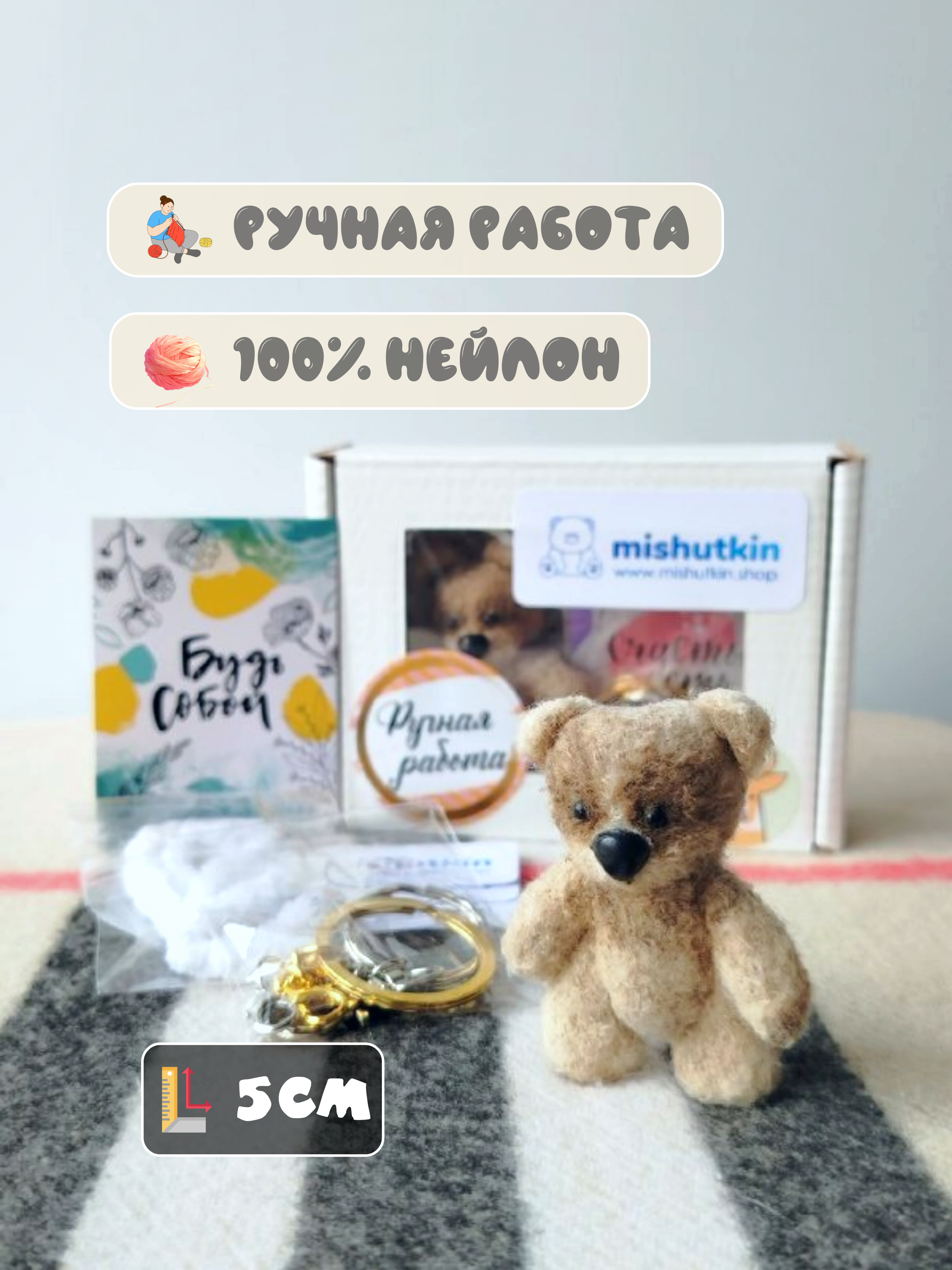 Мини-мишка брелок ручной работы. Светло-коричневый. 5 см. 100% нейлон.