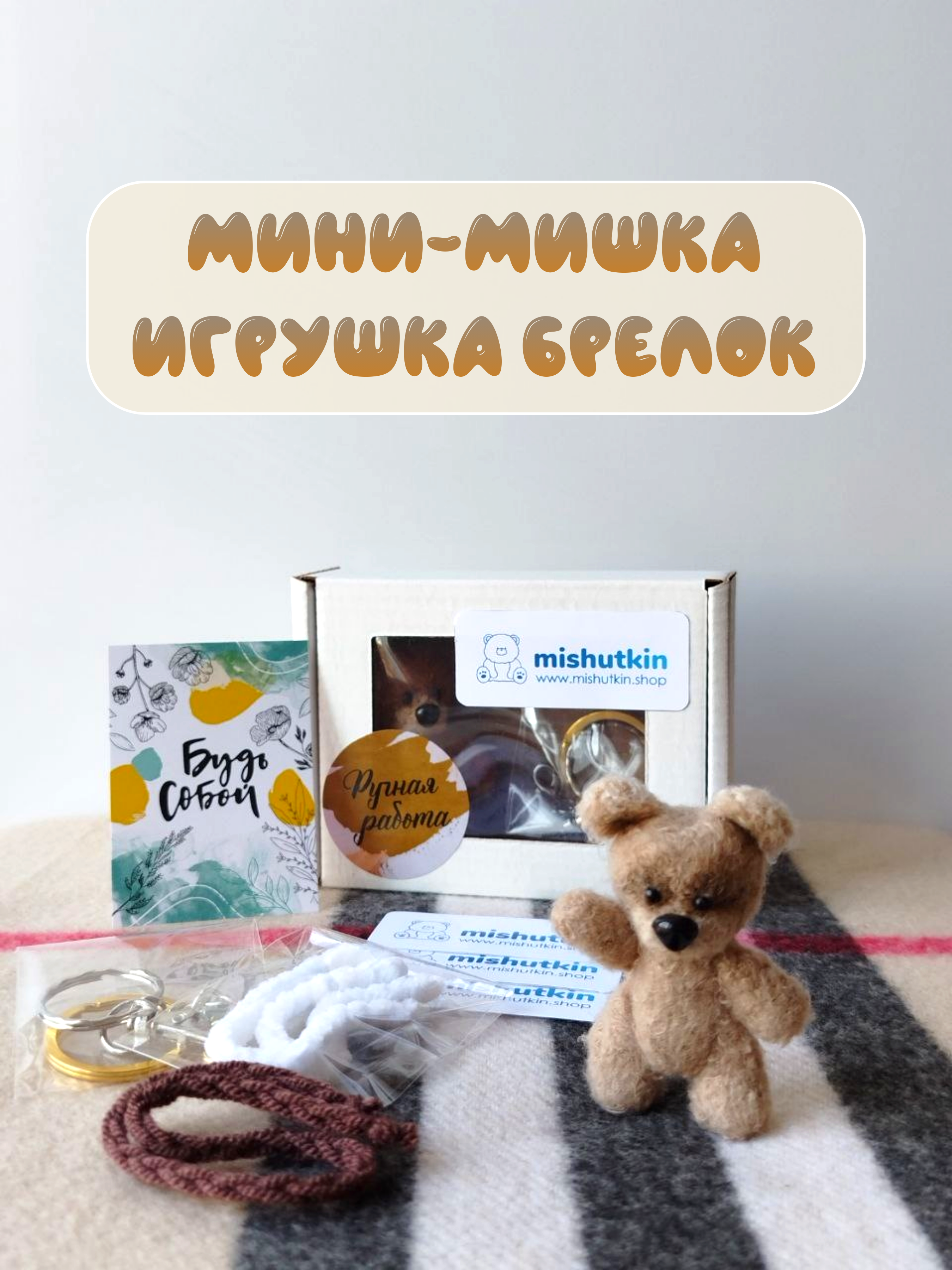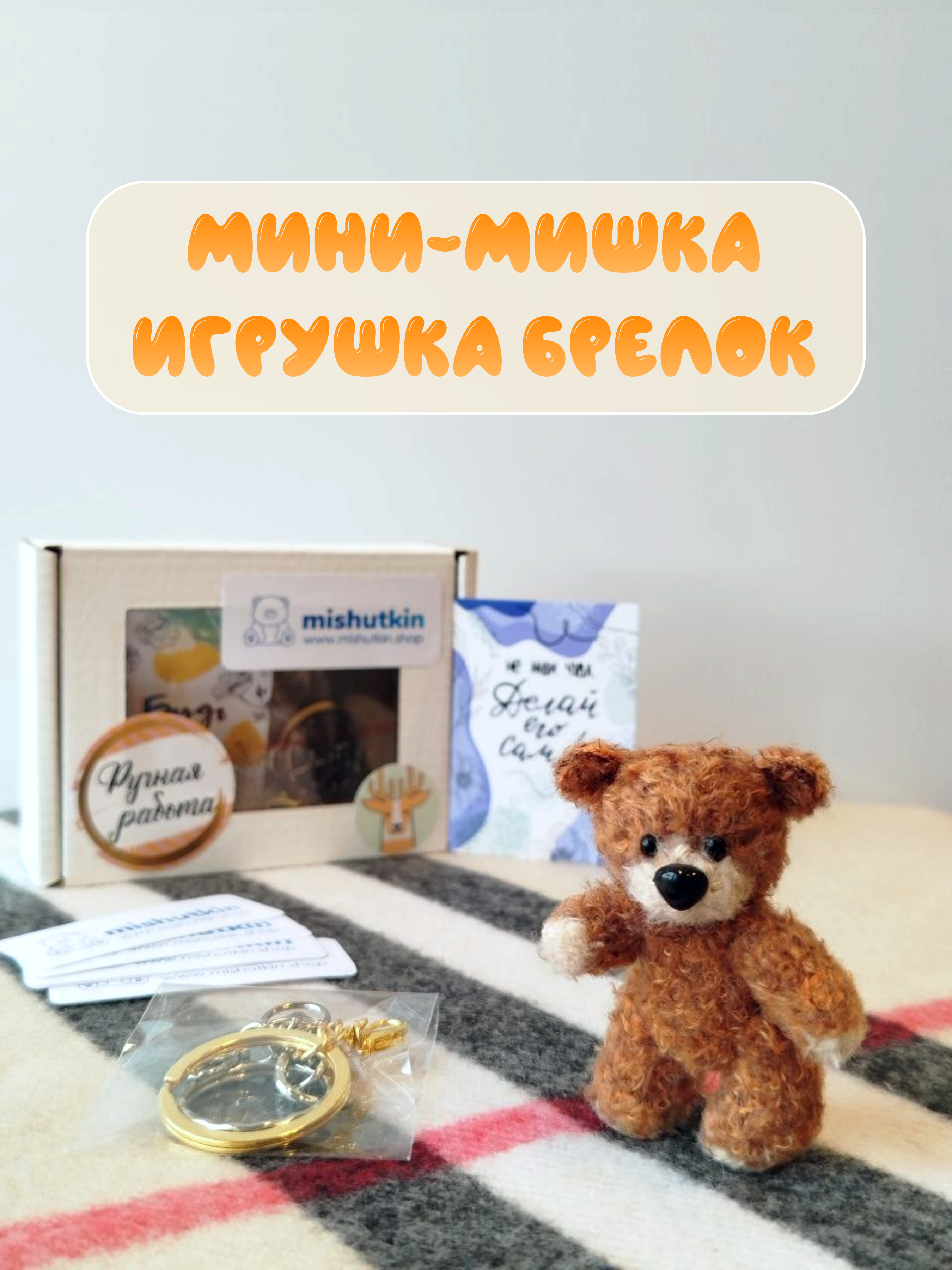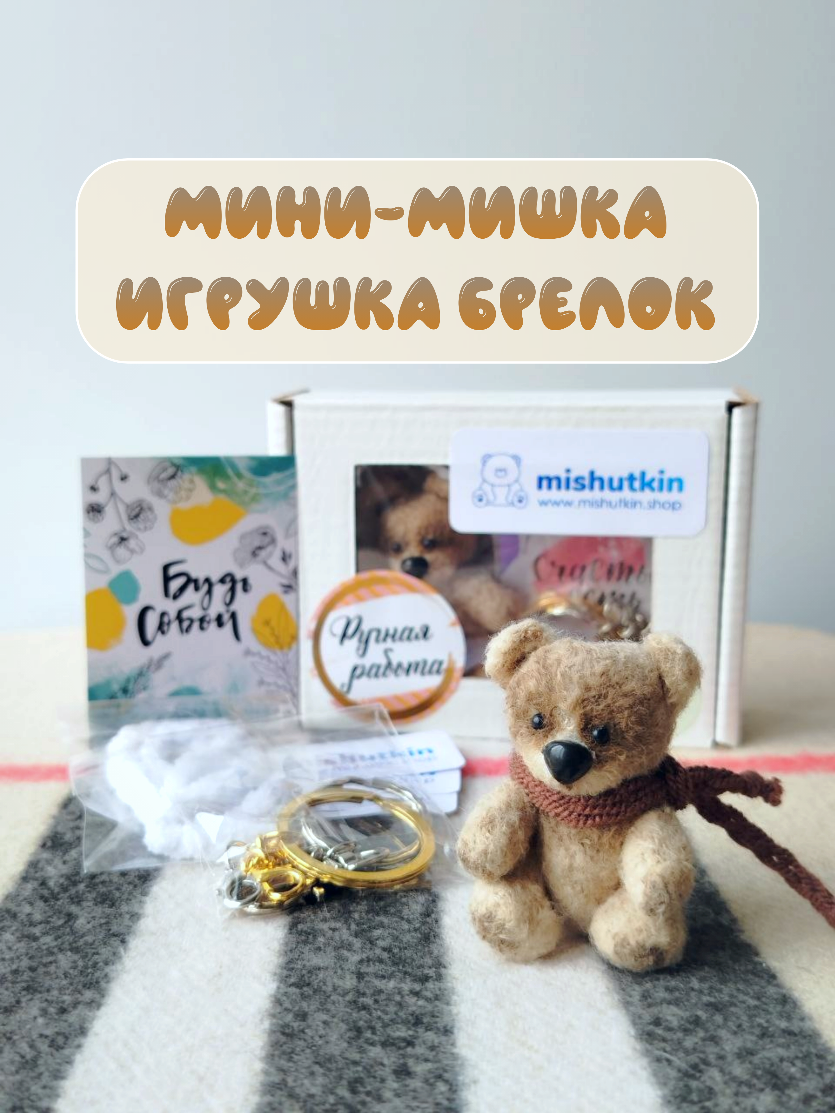 Мини-мишка брелок ручной работы. Светло-коричневый. 5 см. 100% нейлон.