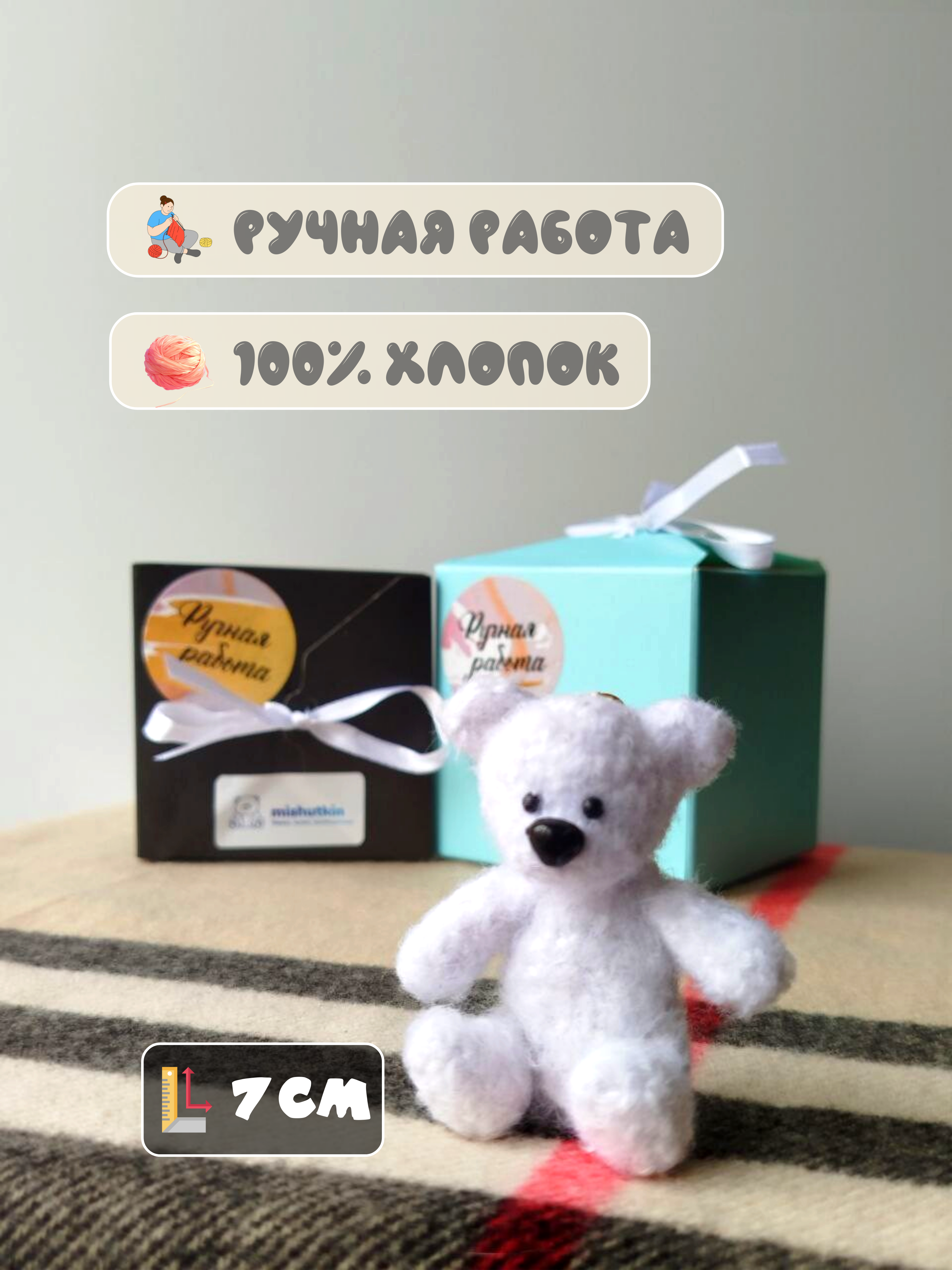 Мини-мишка брелок ручной работы. Белый. 7 см. 100% хлопок