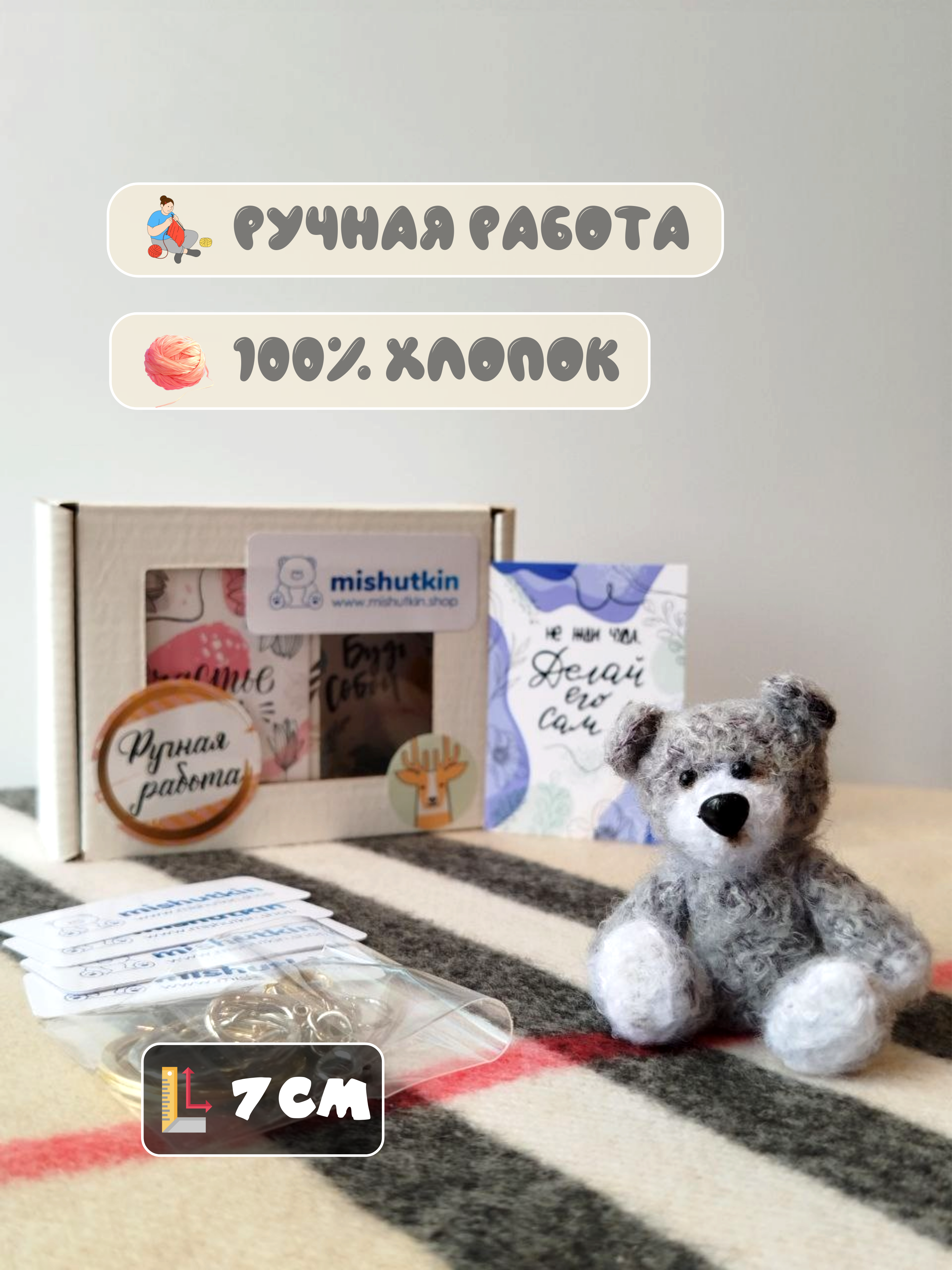 Мини-мишка брелок ручной работы. Серый. 7 см. 100% хлопок