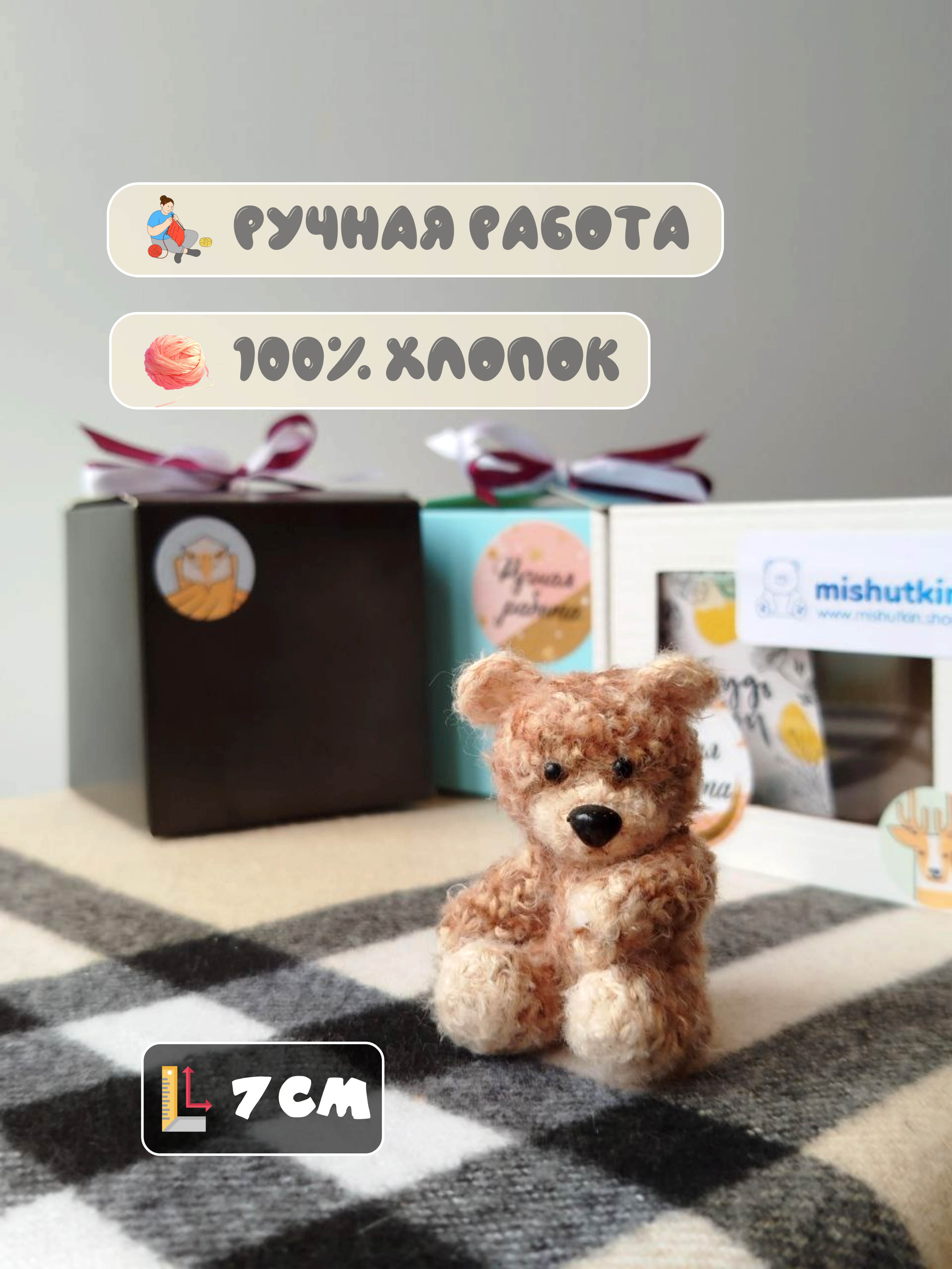 Мини-мишка брелок ручной работы. Коричневый. 7 см. 100% хлопок