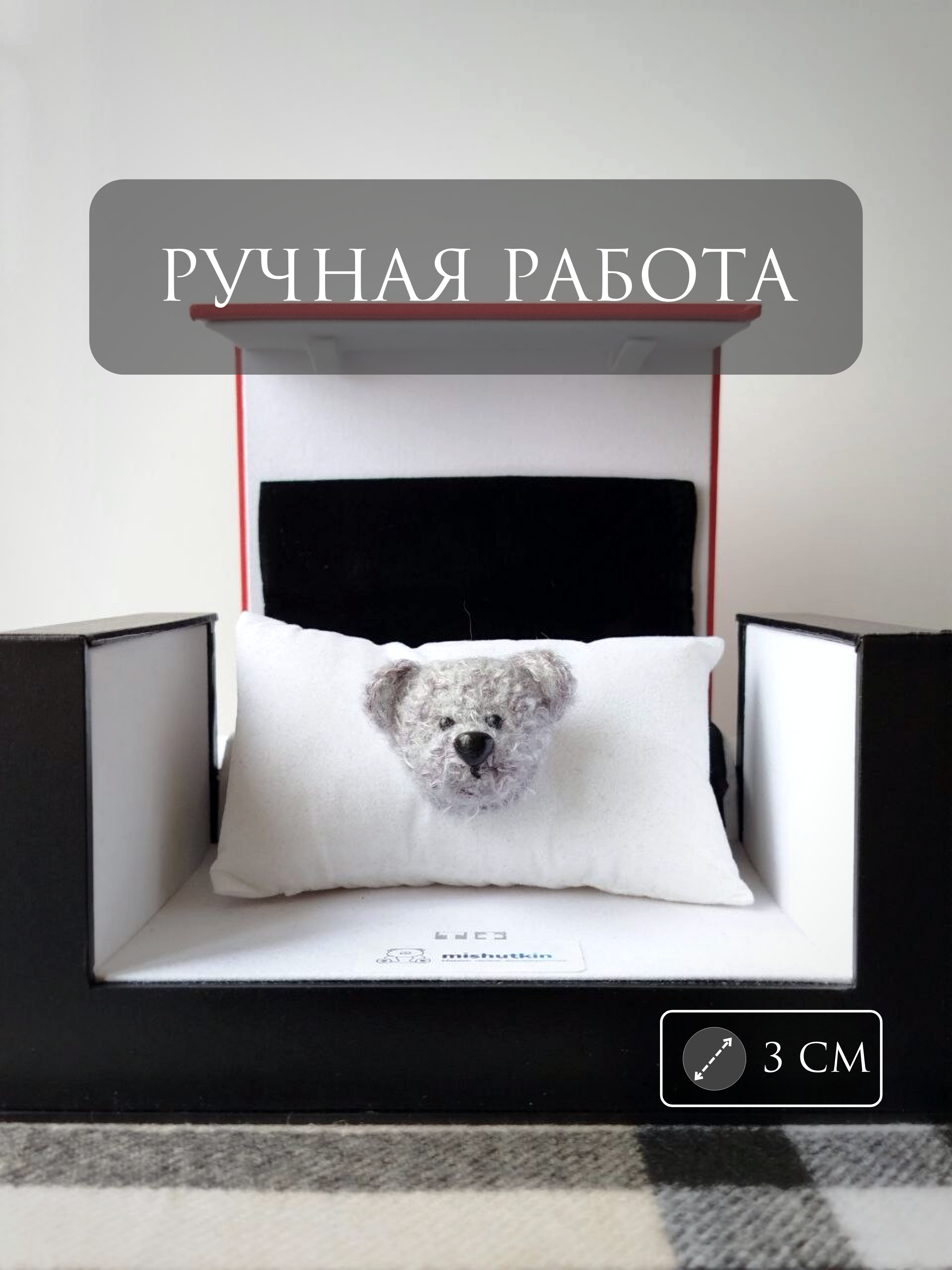 Мишка-брошка Серый с белым, благородный серый – Noble Ash. 3 см. Adelia Baby Toy 100% Nylon.